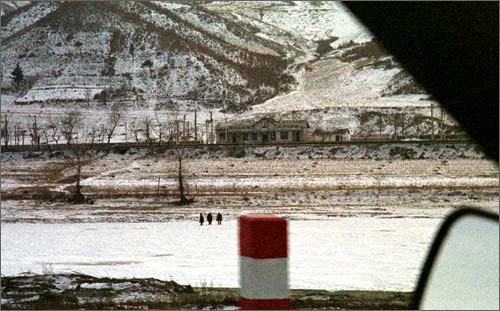 ![]() North Korean border guards take a break while out on patrol on the frozen Tumen River. Behind them can be seen a portrait of Kim Il-sung. |