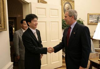 On 13 June 2005, the doors of the White House Oval Office opened to admit a young (37 year-old) Korean man named Kang Chol-Hwan, a refugee from North Korea and perhaps the first person from North Korea for the president to meet. Kang was slightly overwhelmed by the warmth of his welcome, not only from President George W. Bush but also Vice-President Dick Cheney and National Security Adviser Stephen Hadley. Just three days earlier, in the same room, Bush had hosted a visit by South Korean president Roh Moo-Hyun. The welcome for Kang, the refugee, was by all accounts much warmer than that for the head of state, and at forty minutes lasted about as long. |